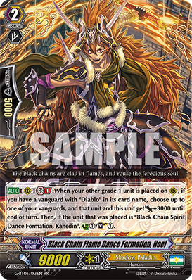 [AUTO](RC) Generation Break 1:When your other grade 1 unit is placed on (RC), if you have a vanguard with "Diablo" in its card name, choose up to one of your vanguards, and that unit and this unit get [Power]+3000 until end of turn. Then, if the unit that was placed is "Black Chain Spirit Dance Formation, Kahedin", Counter Charge (1)/Soul Charge (1).
