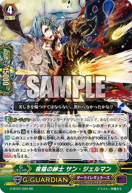 I thought the card was named Saint-German at first, so, Saint-Germain, this guy is totally a badass. Why would I say so? At late game this G Guardian can totally sabotage many clans with skill activate during battle phase. As you have 15 or more cards in your soul, you can granted any of your units Resist until end of the turn. Well not to excited, there's still an exception, if you are against a deck like Messiah, will your locked card will not get affected by this skill.