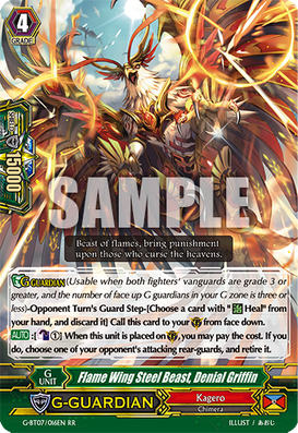 Denial Griffin is powerful for its own skill, I mean I can see how actually this card can totally ruins your opponent's battle phase. Imagine if your opponent left a rear-guard for his last attack, probably this rear-guard already pump up for huge amount of power and Denial Griffin can just get rid of him with 1 Counter Blast. However, this unit will only works to guard an attacking rear-guard, you can still use for guarding a vanguard, but it's skill will be totally wasted.