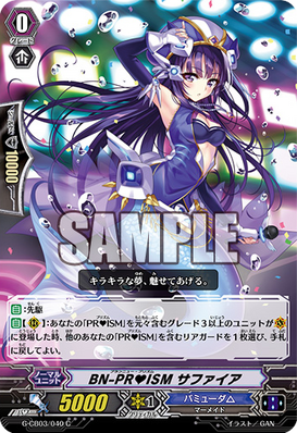Last but not least, Brandnew-PR♥ISM, Sapphire. I couldn't ask more the new Forerunner. The skill can give activate during your Ride Phase or Stride-step. The best part about Sapphire is she remains on the field! It is the best use it with Stride deck, you can return a unit from rear-guard to hand on every single Stride-step. Marvelous:When your grade 3 or greater unit with "PR♥ISM" in its original card name is placed on (VC), you may choose one of your other rear-guards with "PR♥ISM" in its card name, and return it to your hand.