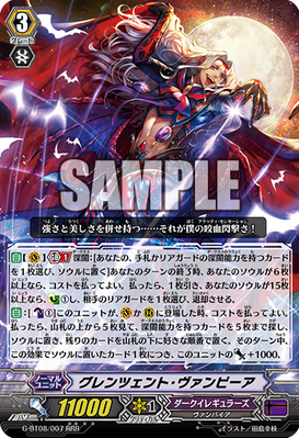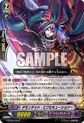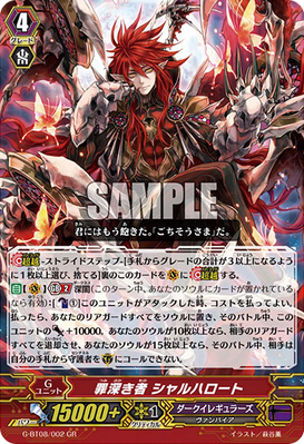 [AUTO](VC) Generation Break 2 Darkness (This ability is active if cards have been put into your soul during this turn):[Counter Blast (1)] When this unit attacks, you may pay the cost. If you do, put all of your rear-guards into your soul, and this unit gets [Power]+10000 until end of that battle. If the number of cards in your soul is ten or more, retire all of your opponent's rear-guards, and if the number of cards in your soul is fifteen or more, until end of that battle, your opponent cannot call cards with the sentinel ability from hand to (GC).One Steeped in Sin, Scharhlot is the latest G unit from Dark Irregulars where you can get this card at "Absolute Judgment" the 8th G Booster Set. This card can be use well as long as you can Soul Charge during your turn to fulfill Darkness requirement to get 10k boost in power. If you have 10 or more cards in your soul, you can wipe out all rear-guards on the field and if you have 15 or more cards in your soul, your opponent cannot guard his attack with Sentinel/Perfect Guard/Quintet Wall from hand.
