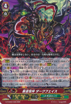 [ACT](VC)[1/Turn] Dark Device (Active when your opponent has no [Stand] units in the same column as this unit):[Counter Blast (1) & Choose a face down card from your G zone, and turn it face up] Choose up to the same number of your opponent's rear-guards as the number of face up cards named "Merciless Mutant Deity, Darkface" in your G zone, until end of your opponent's next turn, they get "[CONT](RC):This unit cannot intercept, and cannot be chosen due to the cost or effect from your cards.", and for each rear-guard chosen with this effect, this unit gets [Power]+5000 until end of turn.